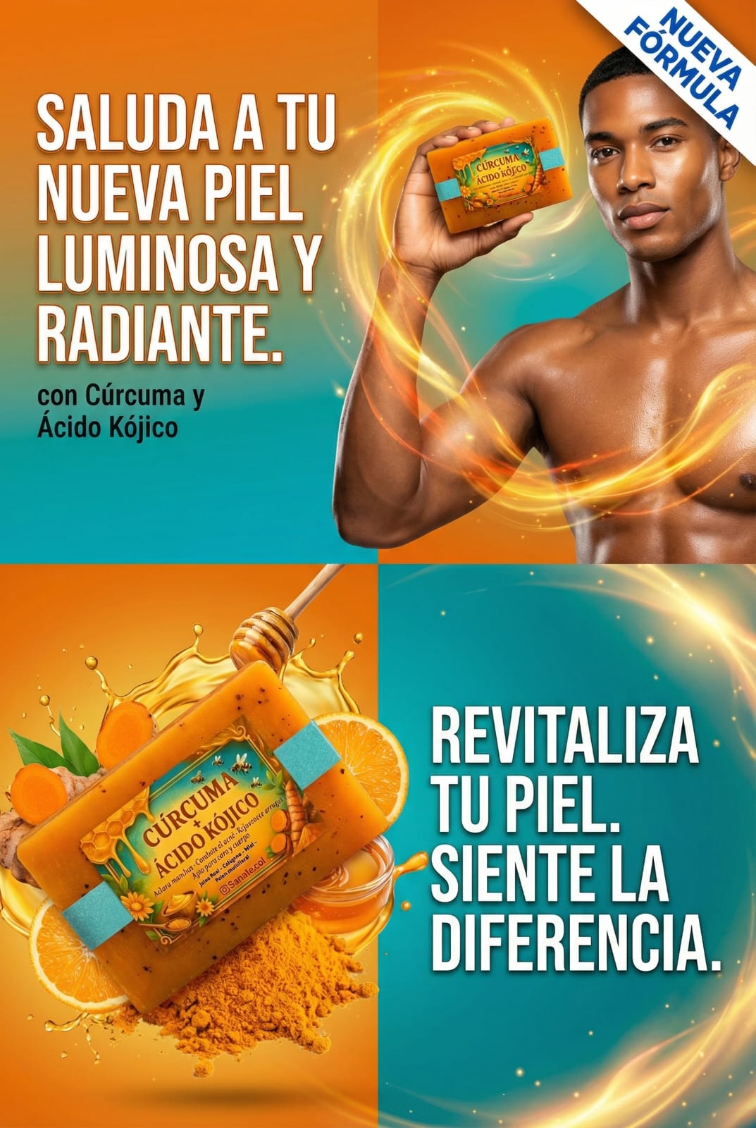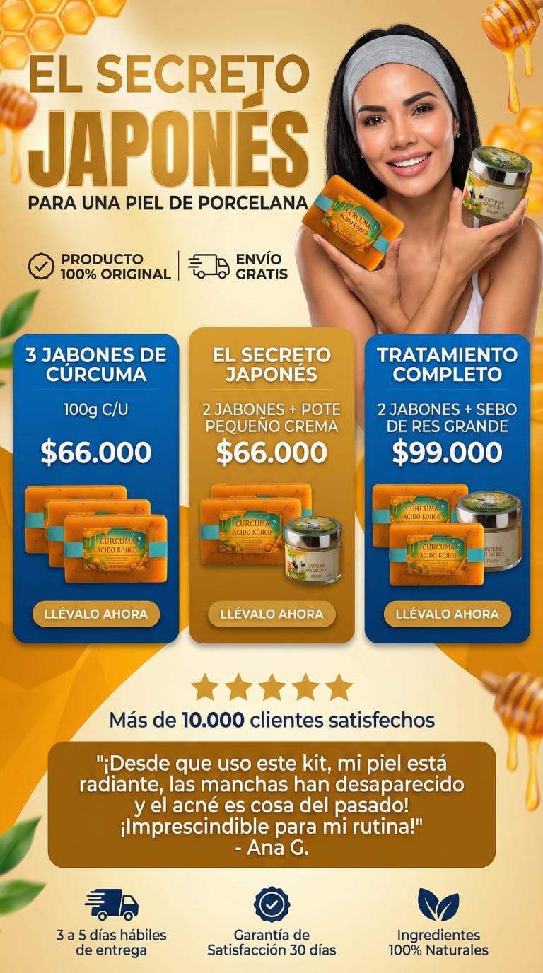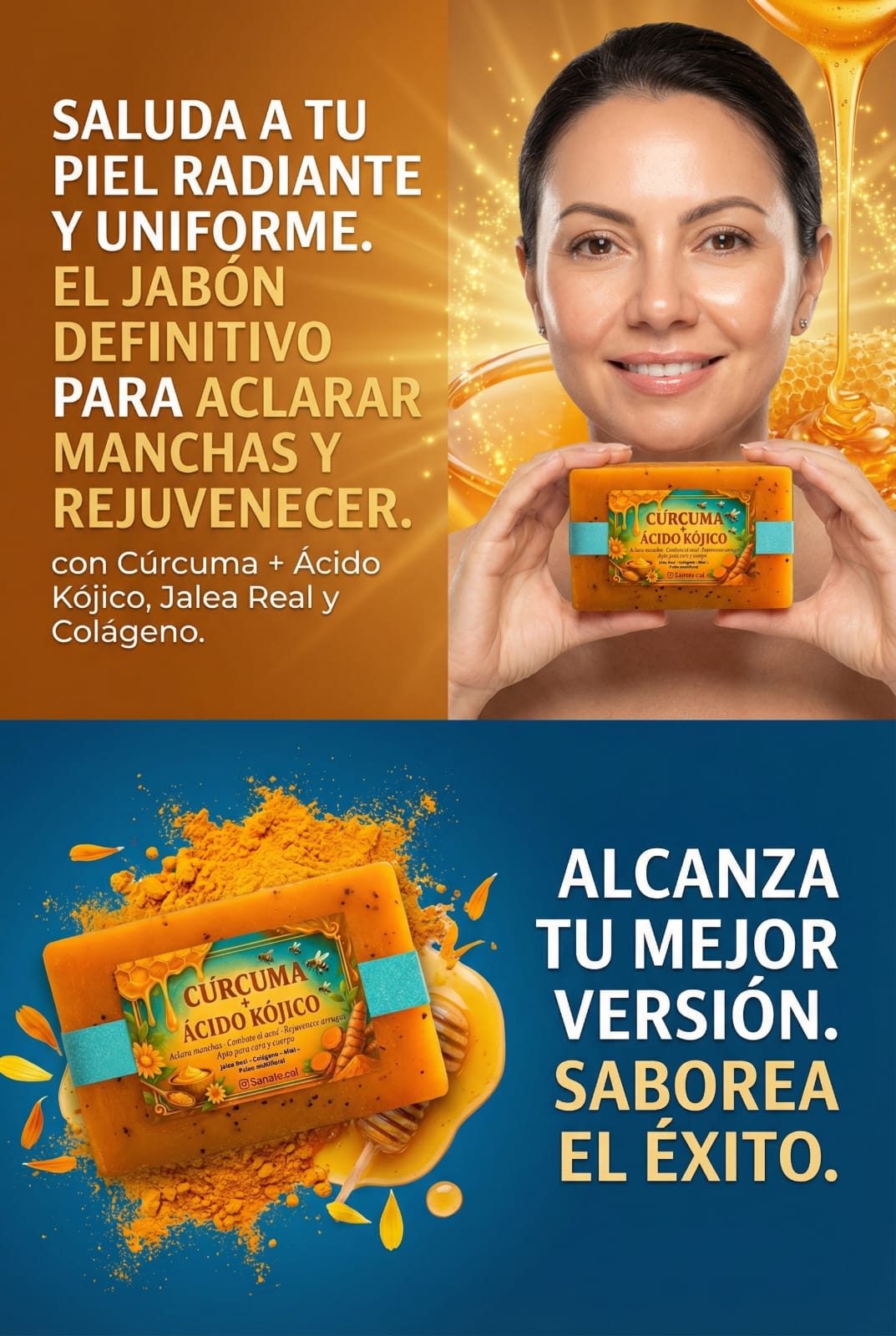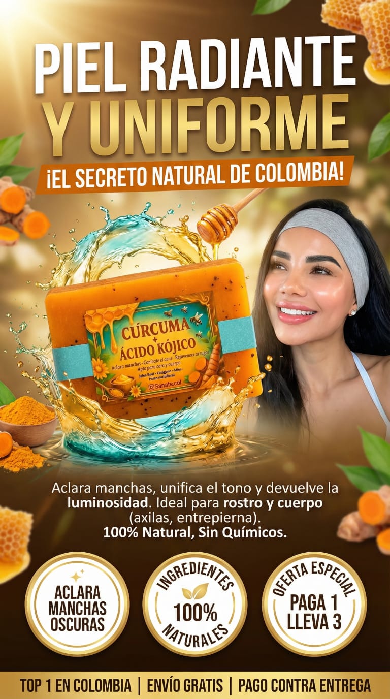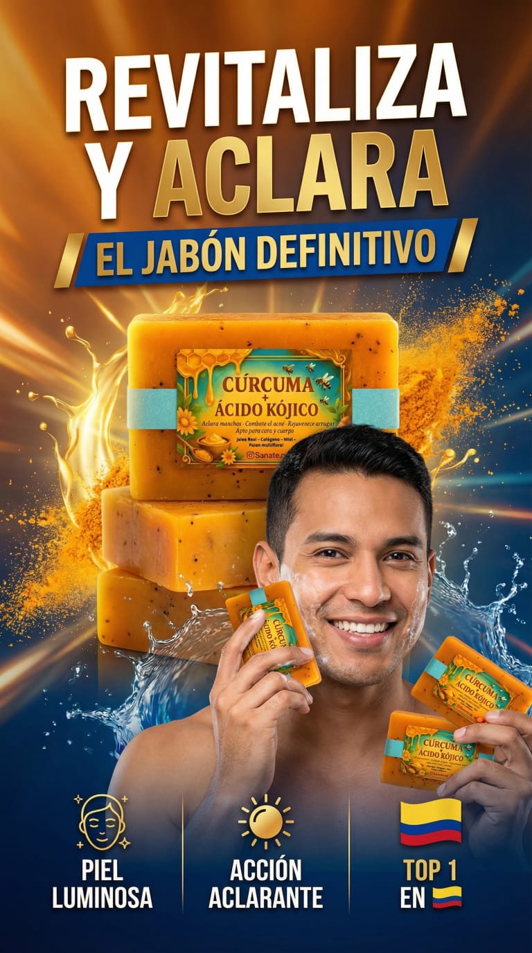 No es un jabón cualquiera, es una fórmula natural avanzada inspirada en la apiterapia. Su combinación de Cúrcuma + Ácido Kójico + Miel + Colágeno + Polen multifloral equilibra, limpia y aclara la piel sin químicos agresivos.